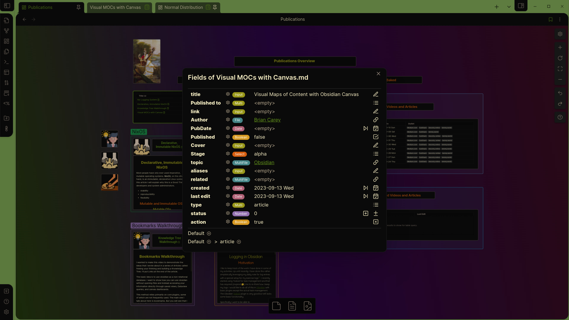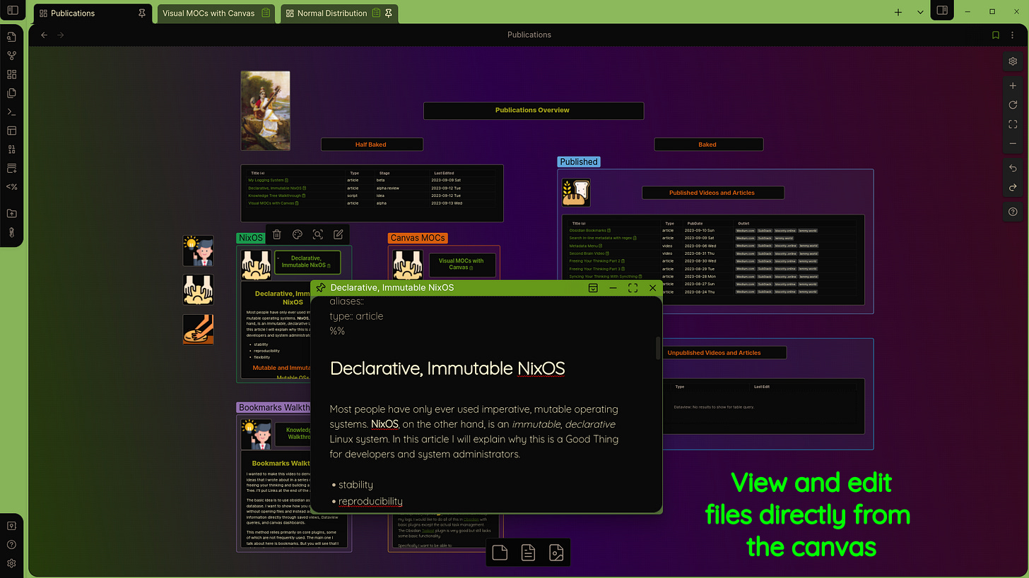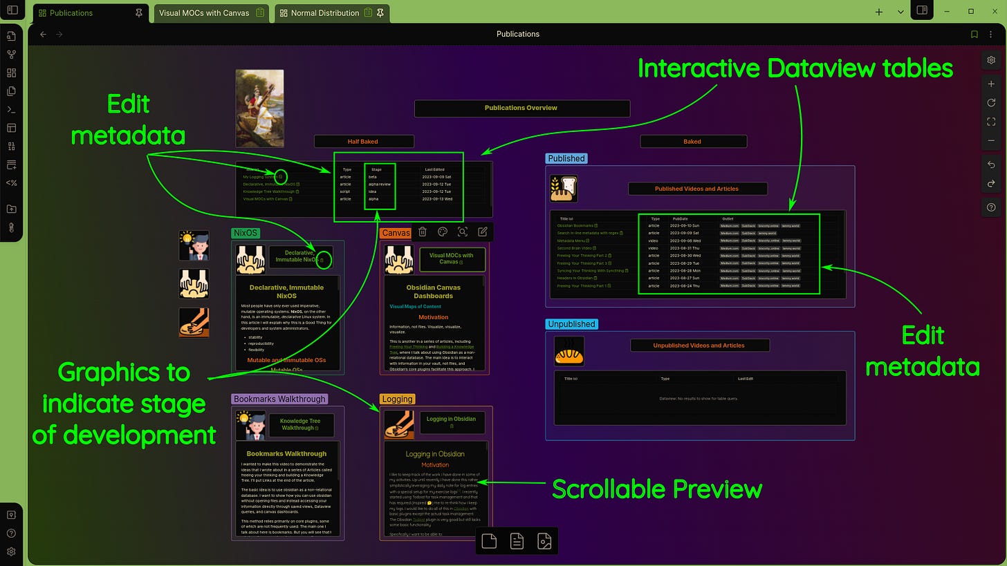 Here I will demonstrate two different types of Visual MOCs. First, an informational dashboard of an academic topic, which could be used by a student or teacher for study or lesson planning. Secondly, a fully interactive dashboard for managing all aspects of my writing and publications. Without leaving the canvas, I can edit both metadata and content of notes.